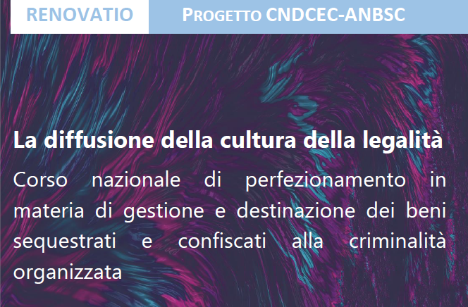 Prenderà il via il prossimo 8 aprile, per concludersi il 13 maggio, la 5^ edizione del corso “La diffusione della cultura della legalità”, che si inserisce nell’ambito del progetto RENOVATIO tra il Consiglio Nazionale dei Commercialisti e l’Agenzia Nazionale per l’amministrazione e la destinazione dei beni sequestrati e confiscati alla criminalità organizzata (ANBSC), coordinato da Giovanna Greco, Segretario Nazionale dei commercialisti con delega a Funzioni giudiziarie e ADR.