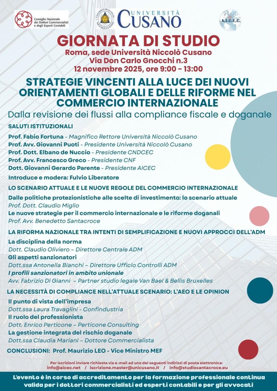 “Strategie vincenti alla luce dei nuovi orientamenti globali e delle riforme nel commercio internazionale. Dalla revisione dei flussi alla compliance fiscale e doganale”. È questo il titolo della giornata di studio organizzata da Consiglio nazionale dei commercialisti, Università Cusano e A.I.C.E.C. L’evento si terrà il prossimo 12 novembre, dalle 9:00 alle 13:00 a Roma, presso la sede dell’Università Niccolò Cusano, in via Don Carlo Gnocchi 3.