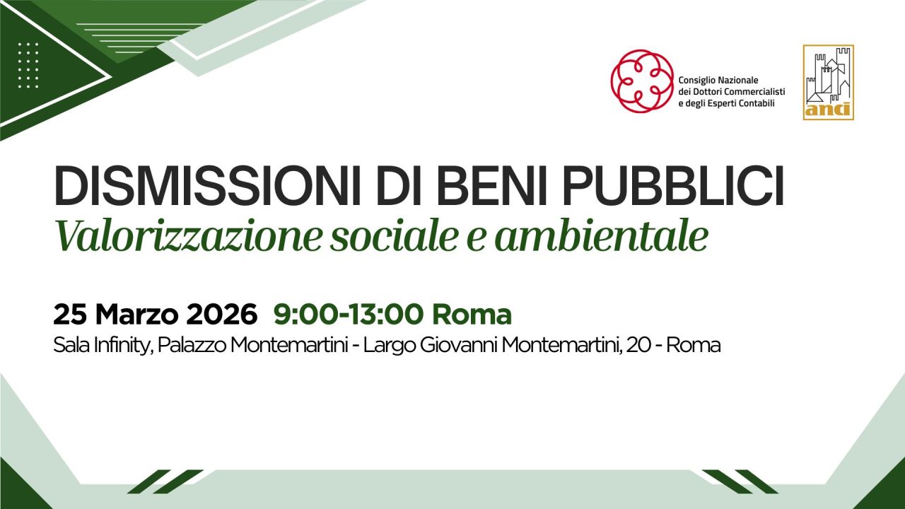 “Dismissione di beni pubblici. Valorizzazione sociale e ambientale” è il titolo del convegno organizzato dal Consiglio Nazionale dei Commercialisti, in collaborazione con ANCI, che si svolgerà il prossimo 25 marzo a Roma presso il Palazzo Montemartini in largo Giovanni Montemartini 20 (ore 9.00-13.00), con il fine di affrontare il tema del rischio di depauperamento patrimoniale connesso al protratto inutilizzo di un bene pubblico. Sarà possibile seguire l’evento anche in diretta streaming.