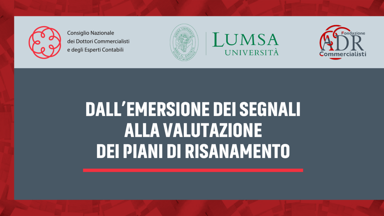 Prenderà il via il prossimo mercoledì 10 dicembre il corso gratuito in diretta online “Dall’emersione dei segnali alla valutazione dei piani di risanamento“, organizzato da Consiglio Nazionale dei Commercialisti, Fondazione ADR Commercialisti e Università LUMSA per gli iscritti all’Albo dei dottori commercialisti e degli esperti contabili.