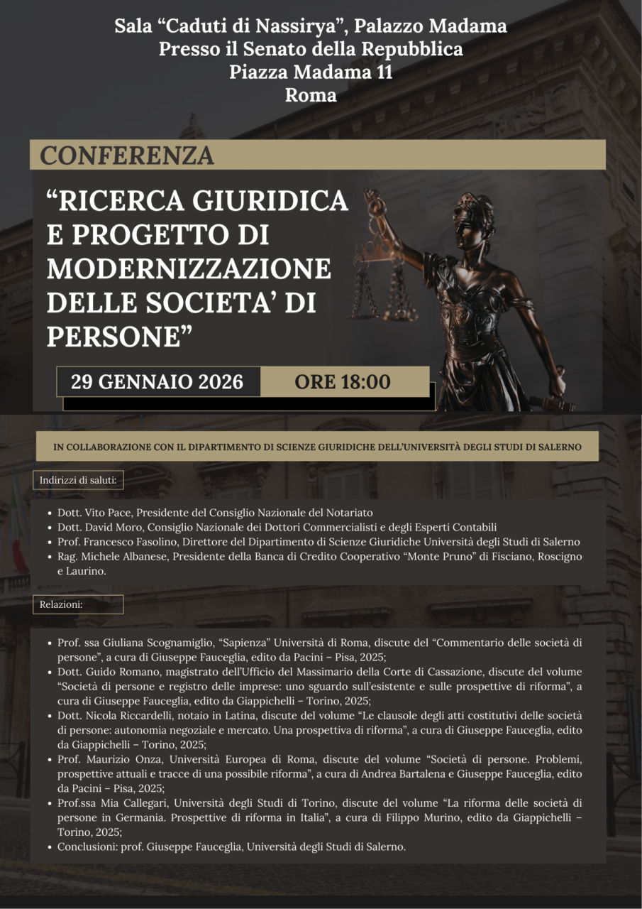 “Ricerca giuridica e progetto di modernizzazione delle società di persone” è il titolo della conferenza in programma oggi, 29 gennaio, alle ore 18:00, presso la Sala “Caduti di Nassirya” di Palazzo Madama presso il Senato della Repubblica.