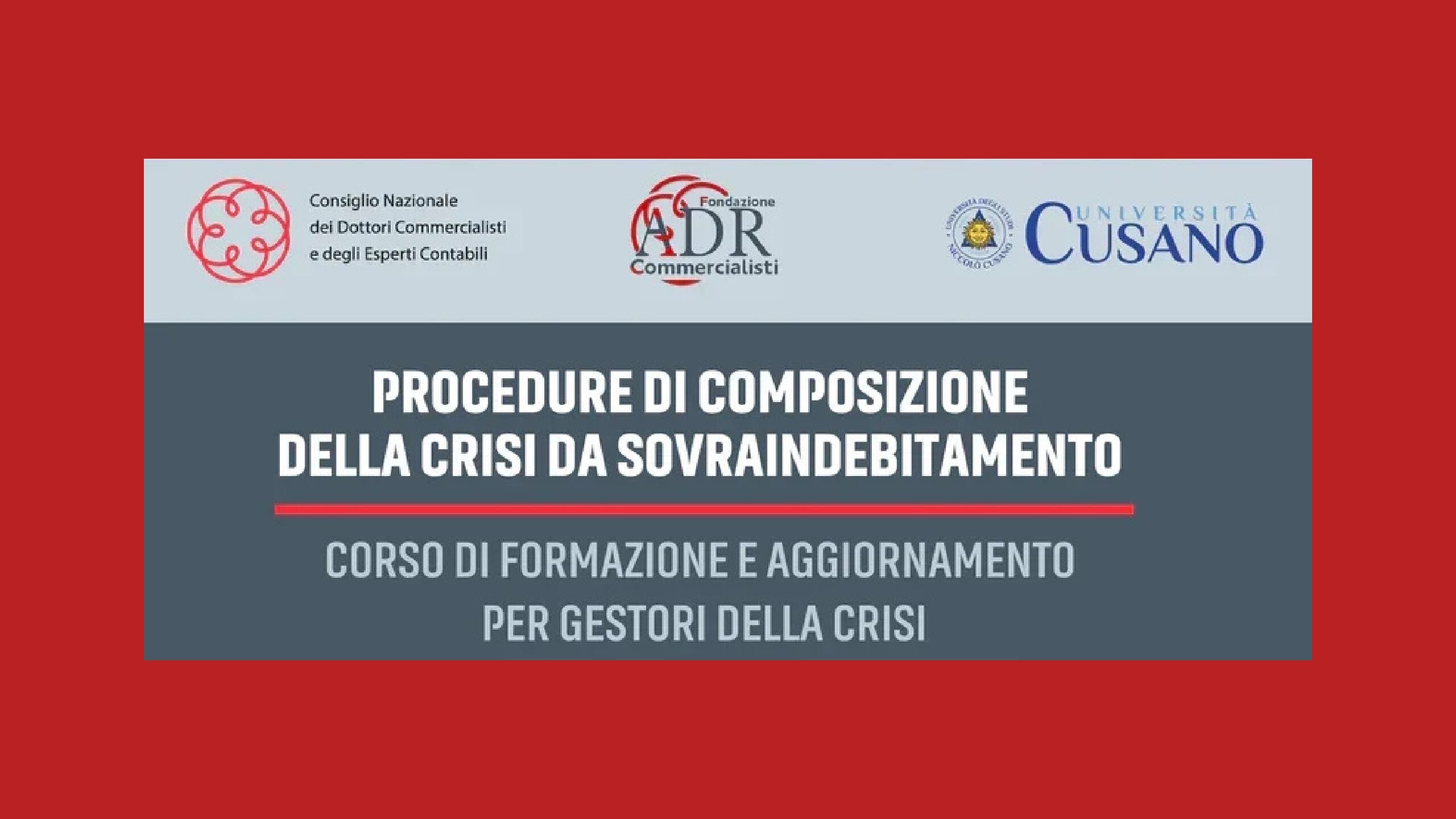 Torna fruibile da oggi 28 gennaio fino al 30 giugno 2026, il corso di formazione e aggiornamento e-learning di 40 ore “Procedure di composizione della crisi da sovraindebitamento“, organizzato dal Consiglio Nazionale dei Commercialisti, dalla Fondazione ADR Commercialisti e dalla Libera Università degli Studi Niccolò Cusano.